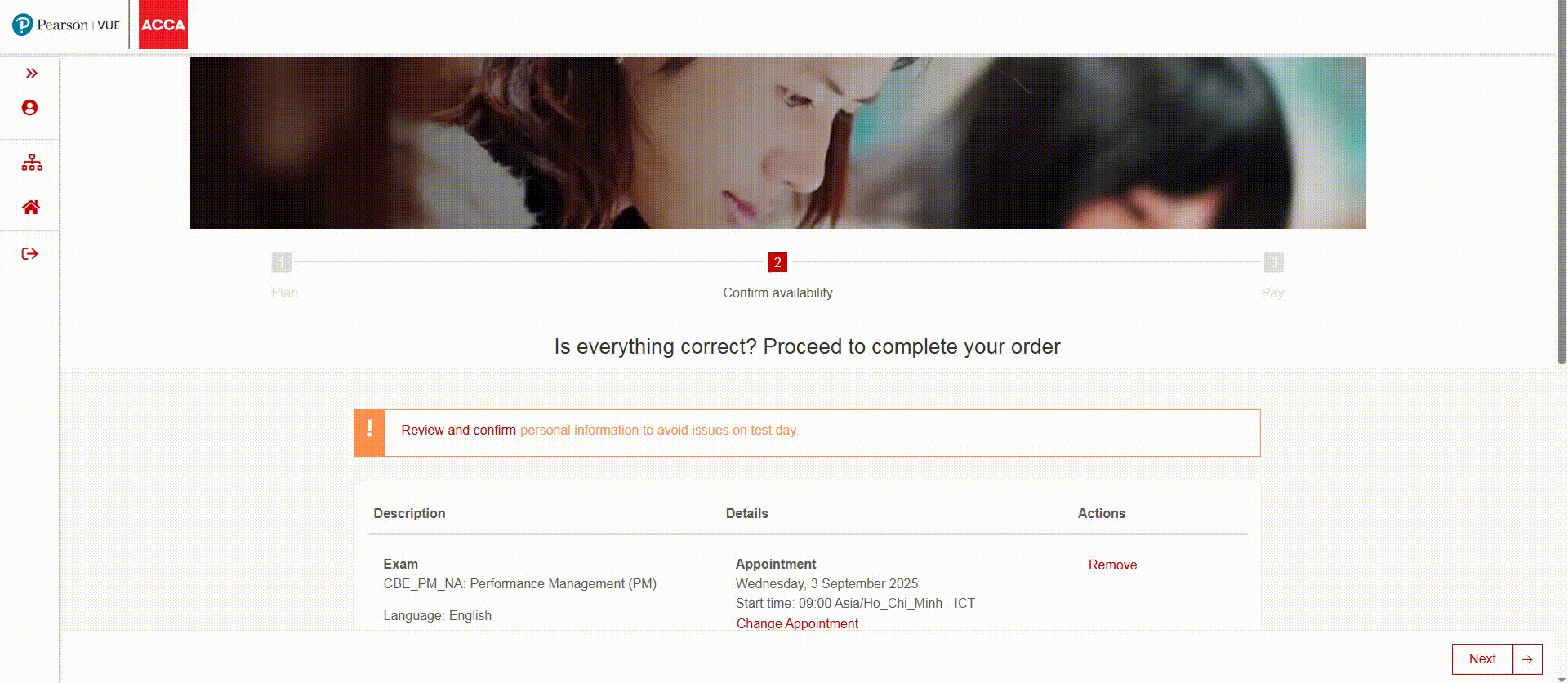 - Click vào "Confirmation Availability" để xác nhận địa điểm thi và thời gian thi