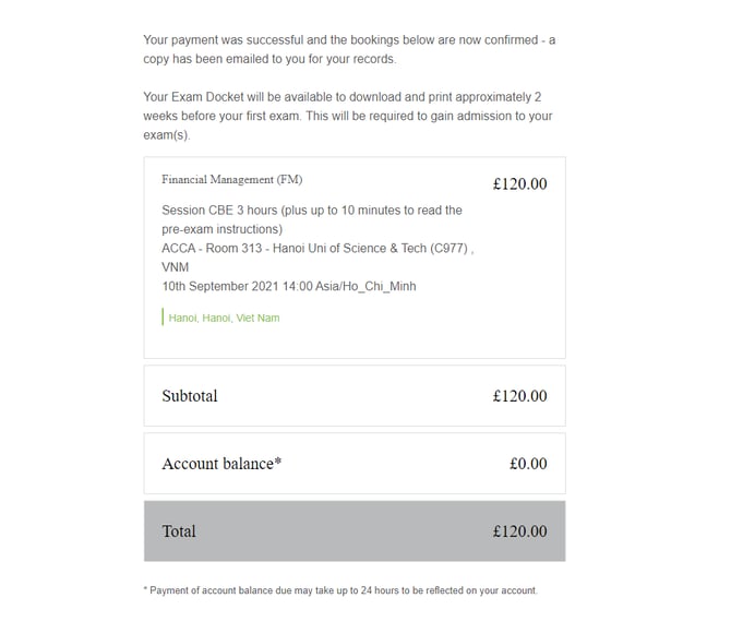 Sau khi thanh toán thành công, màn hình hiện ra xác nhận về toàn bộ thông tin về môn thi ACCA đã đăng ký gồm môn thi, ngày giờ thi, địa điểm thi và xác nhận về phí theo bảng đã đóng.