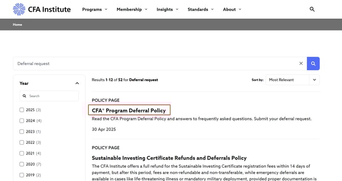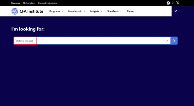 Bước 2: Ở mục tìm kiếm gõ từ khóa "Deferral request" vào ô tìm kiếm ở góc phải màn hình và bấm vào bài viết "CFA Program Deferral Policy"