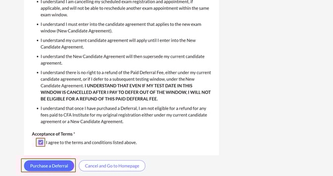 - Bạn kéo xuống cuối trang và bấm chọn vào ô "I agree to terms and conditions listed above" và bấm nút "Purchase a Deferral"