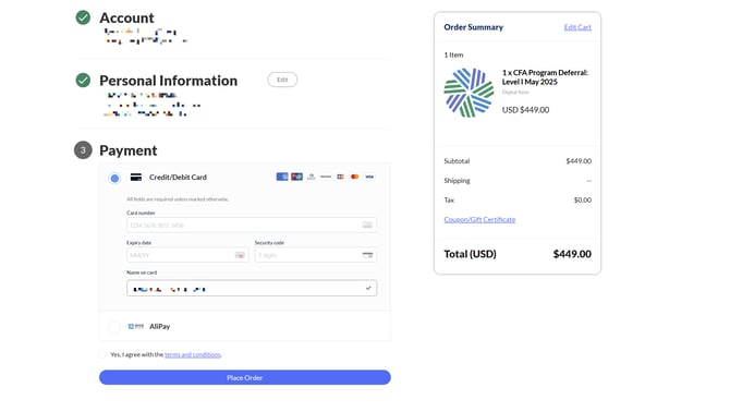 Sau đó dán mã voucher đã được nhận vào. Viện CFA sẽ trừ hết phí về 0 để bạn đăng ký đặt lịch thi và không tốn thêm phí.
