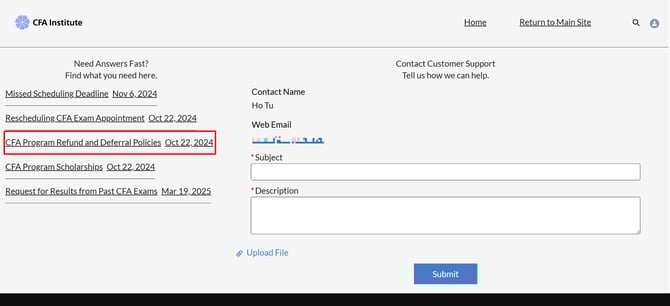 - Chọn "CFA Progtam Refund and Deferral Policies". Mô tả tình huống và đính kèm tài liệu liên quan theo yêu cầu.