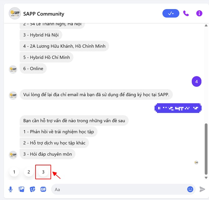 Học viên nên chọn theo điều hướng từ Fanpage để câu hỏi được chuyển về đúng bộ phận chuyên môn, giúp việc hỗ trợ diễn ra nhanh chóng và thuận tiện hơn.