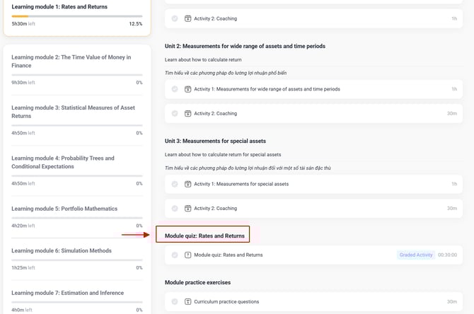 Tại giao diện nội dung môn học, xuống gần cuối từng Learning Module và chọn mục Module quiz