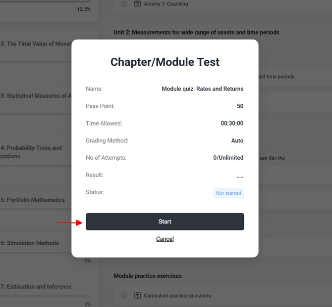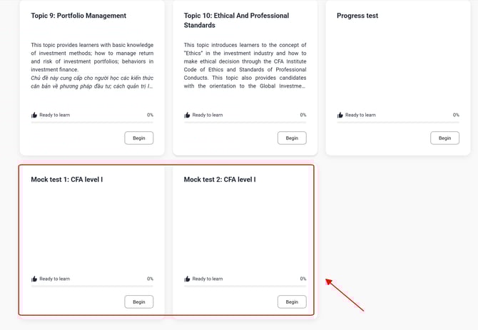 - Đối với CFA Level II, Mock Test sẽ được mở trong khóa ôn thi (Revision/Ôn tập) sau khi học viên hoàn tất đăng ký chính thức kỳ thi với viện CFA.
