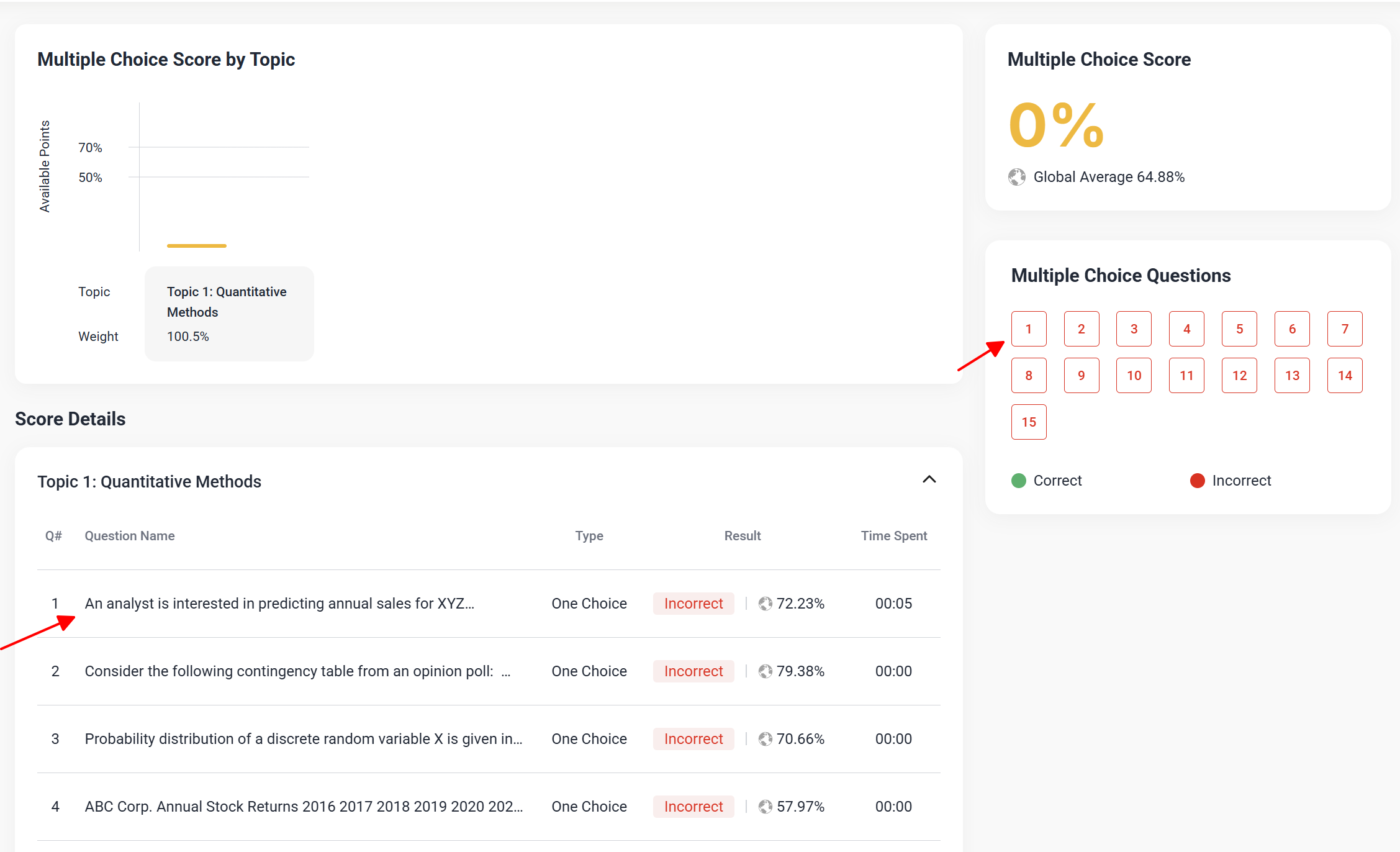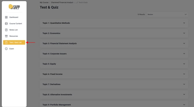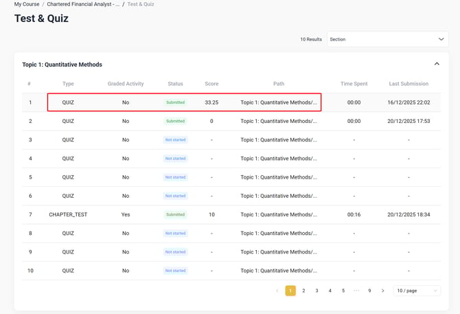 - Chọn góc trái mục "Test/Quiz List" để xem kết quả chi tiết
