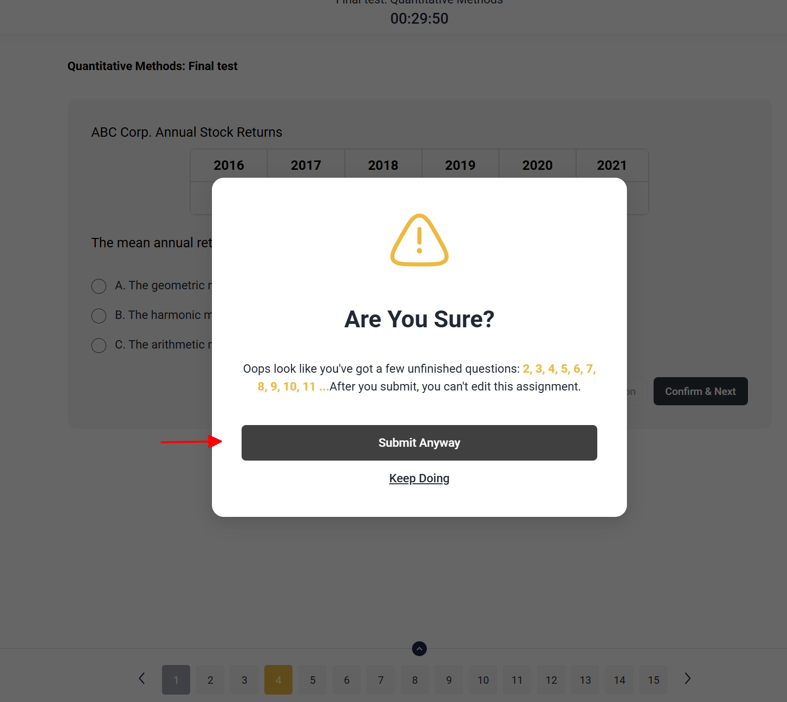 - Sau khi hoàn thành bài test bằng cách bấm nút "Submit Anyway"
