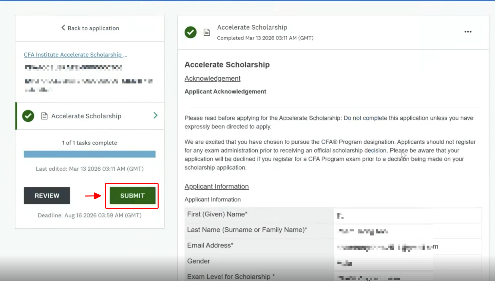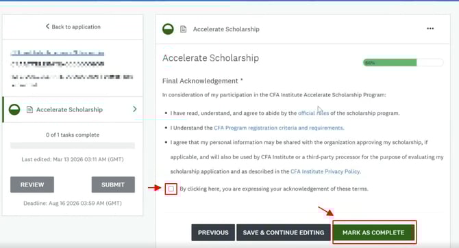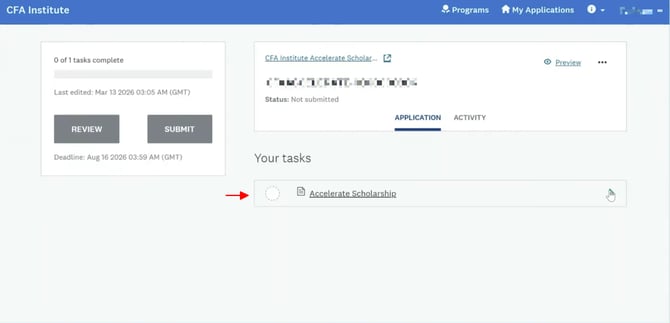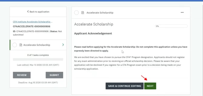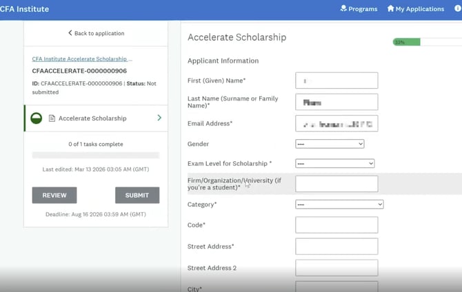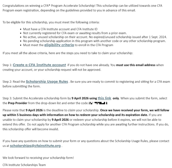 Để kích hoạt học bổng học viên sẽ nhận được email từ Viện CFA tựa:"Congratulations on Winning CFA Institute Accelerate Scholarship!"