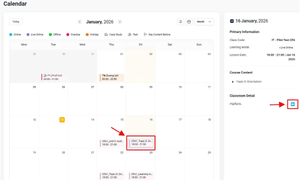 Tại lịch học, bạn vui lòng chọn buổi học đúng ngày và khung giờ của lớp (ô được bôi viền như trong hình).
