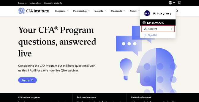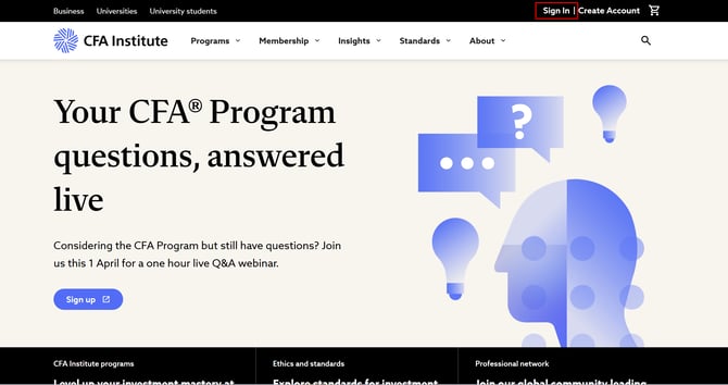- Bước 1: Truy cập vào Website: https://www.cfainstitute.org/ và bấm vào chữ "Sign in" góc phải trên cùng của màn hình để đăng nhập vào tài khoản CFA của bạn.