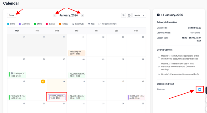 - Với những buổi học Live Online với Giảng viên: Học viên vui lòng bấm vào module học tương ứng trên lịch, hệ thống sẽ hiển thị thông tin chi tiết buổi học phía bên phải. Học viên bấm vào icon Zoom để chuyển hướng sang Zoom lớp học.