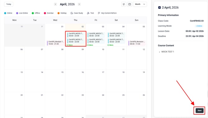 Với những buổi tự học trên LMS hoặc buổi Test: Học viên vui lòng bấm vào buổi học tương ứng trên lịch, hệ thống sẽ hiển thị thông tin chi tiết buổi học phía bên phải. Học viên bấm vào Start để chuyển hướng vào bài học/ test.