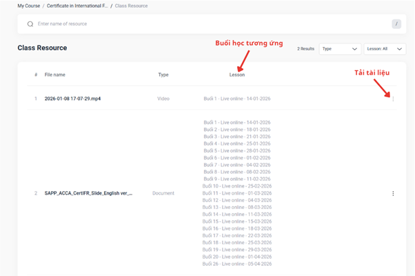 Sau khi truy cập giao diện Class Resource, học viên tìm đến tài liệu/ file ghi âm cần tìm và click chọn để xem lại hoặc tải xuống tài liệu (nếu có).