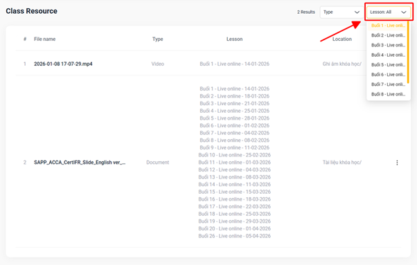 Hình 5 - Tính năng lọc Lesson ở Class Resource