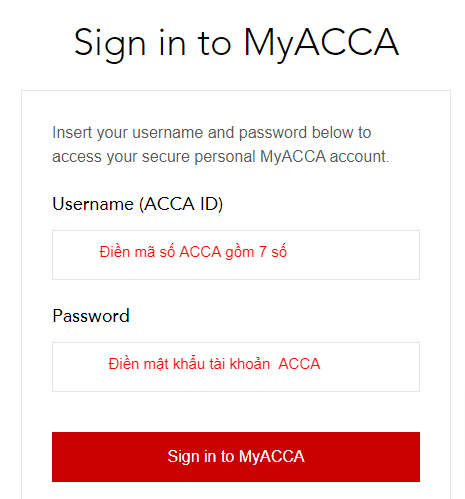 Vào trang chủ của ACCA tại đây, chọn My ACCA. Đăng nhập vào tài khoản ACCA (mã số ACCA của bạn và mật khẩu).